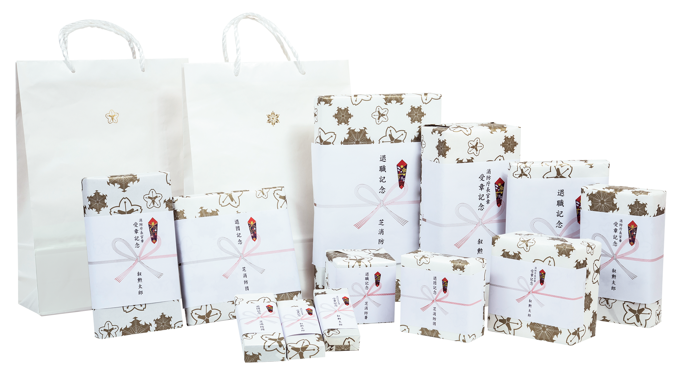 弊社の記念品は、オリジナルの署・団マークがデザインされた包装紙で包装しております。 消防記念品としての包装紙ですので、贈る方の想いをお伝えできます。